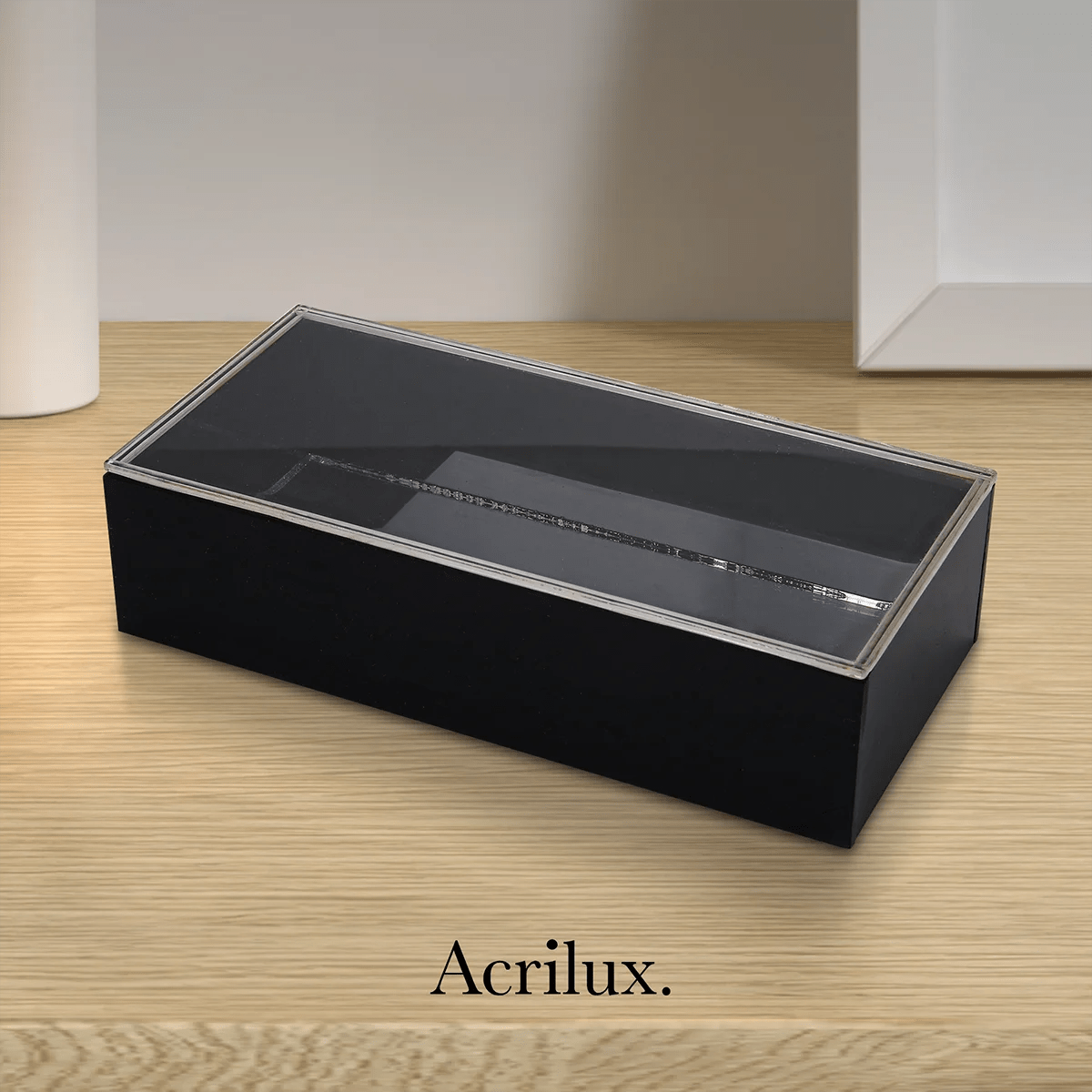 Caja alhajero fabricada en acrílico de alta calidad de 3 mm de grosor, con tapa gruesa de 6 mm y base con acabado tipo espejo.
